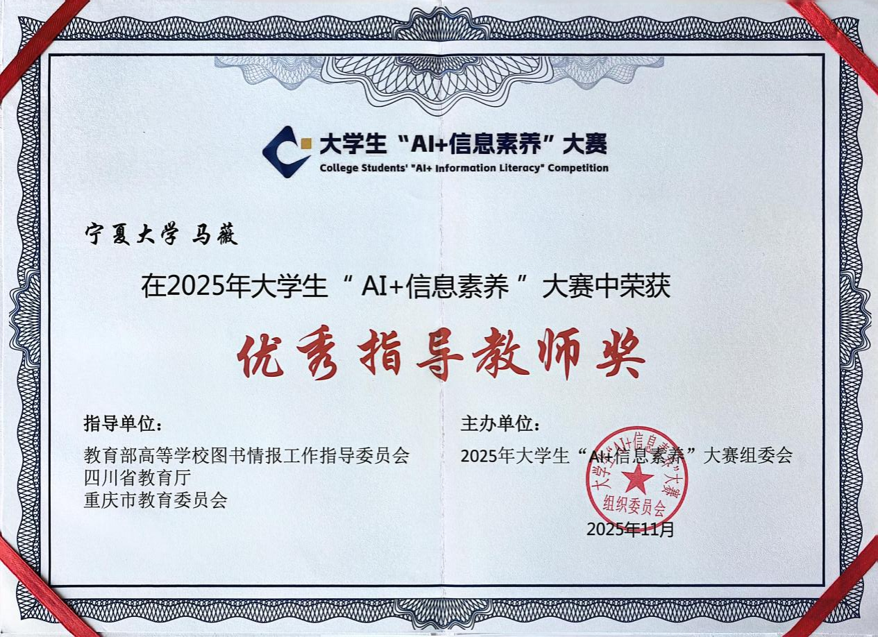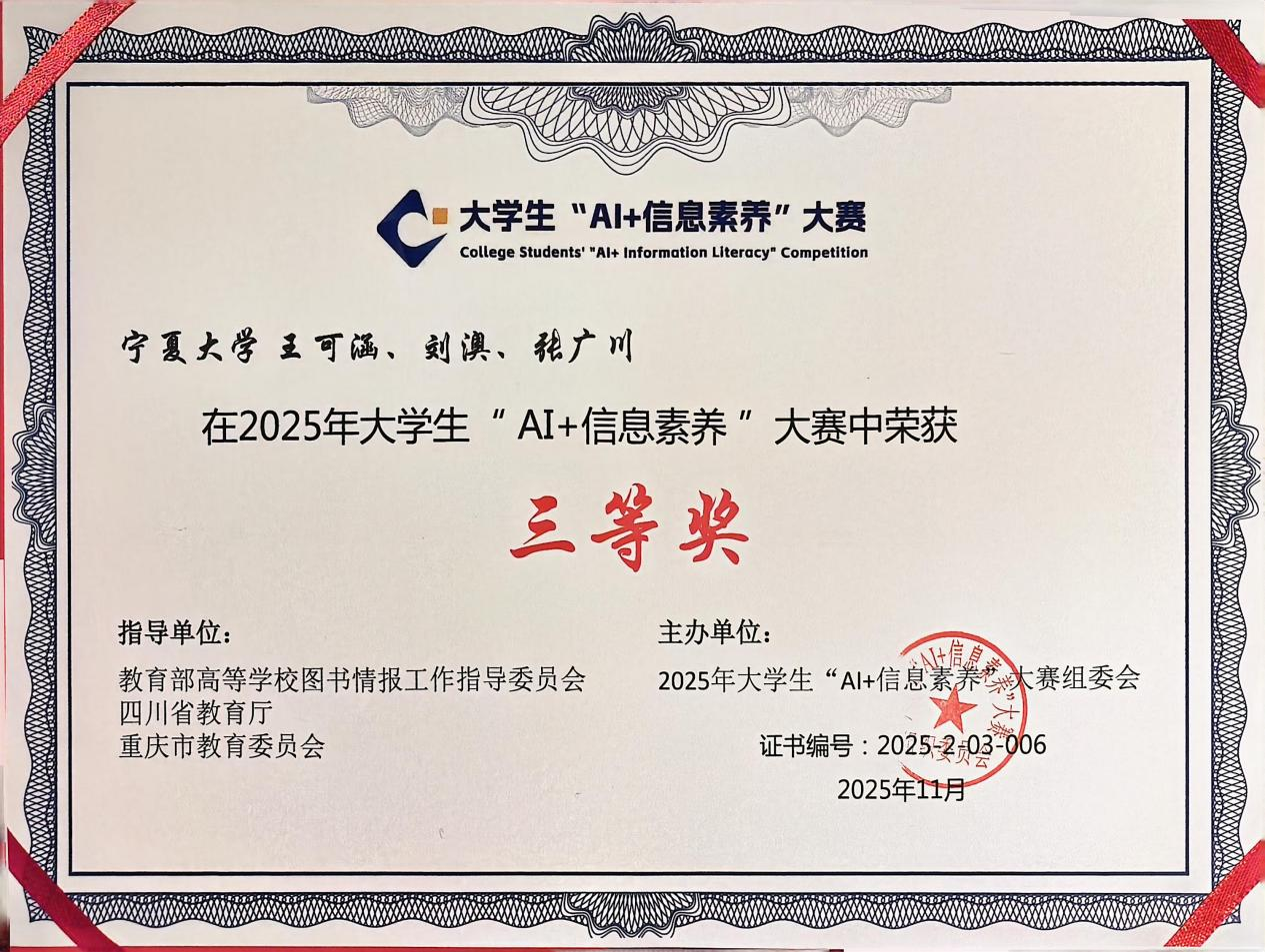 近日,2025年大学生“AI+信息素养”大赛联赛(本科生、研究生)暨信息素养教育教学工作研讨会在成都圆满落幕。威尼斯人澳门官网 研究生王可涵、刘澳等3人组成的参赛团队,在马薇副教授的悉心指导下,凭借扎实的专业功底与出色的综合素养,从全国众多参赛队伍中脱颖而出,荣获研究生组全国三等奖。